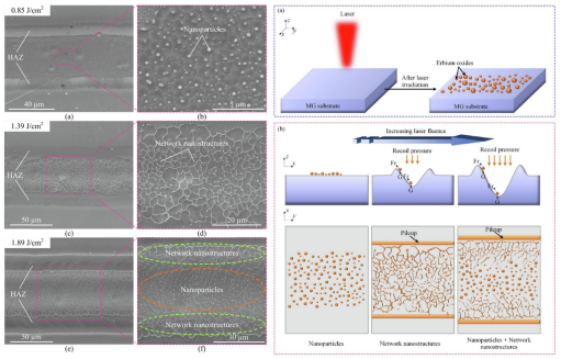 對此,他們還對這種結(jié)構的形成及演化進行了討論(如圖2所示),能量相對較(jiào)低時,納米粒子以離散(sàn)形式出現在照射區域;當將能量增加時,除熱影(yǐng)響區外,照射區域呈現出(chū)大麵積的網絡納米結構。這些(xiē)網絡納米結構並不總是完全(quán)封閉的,尤其是在輻照區域(yù)的中(zhōng)心(xīn)。隨著能(néng)量進一步增加,整(zhěng)個輻照區域具有熱影響區周圍的網絡納米結構和位於(yú)輻照區域中心的納米顆粒兩種結構。並且,隨著激光能量密(mì)度的增加,這種納米粒(lì)子的(de)數量不斷增多(duō),當數量過多時兩兩相互連接形成納米線,或者納米網格結構(gòu),納(nà)米顆粒可歸因於(yú)激光誘導的元素富集(即無(wú)定形(xíng)氧化鉺(ěr))及其與基材的潤濕性不匹配。此外,在反衝壓力和表麵形貌的共同影響下(xià),納(nà)米粒子(zǐ)的(de)擴散和連接會導致網絡納米結構的形成。這種納米顆粒(lì)和納米網格的應用十分(fèn)廣泛(fàn),如作為增強材料等。