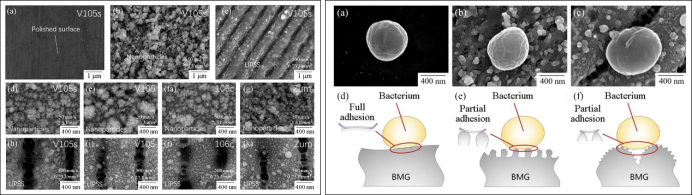 圖3.左(zuǒ)圖為:飛秒激光納米結構表麵的形貌:(a)V105s的拋(pāo)光表(biǎo)麵;(b)V105s的納米粒子結構表麵;(c)V105的(de)LIPSS;(d-g)Zr-BMGs的納米顆(kē)粒結(jié)構表(biǎo)麵;(h-k) Zr-BMG的LIPSS。右(yòu)圖為:金黃色葡萄球菌在(a)拋光表麵、(b)納米顆粒結(jié)構表麵和(c)LIPSS上的表麵接觸狀態。表麵細菌粘(zhān)附狀態示意圖(d)在拋光表麵上,(e)在納米結構表麵上和(f)在LIPSS上。