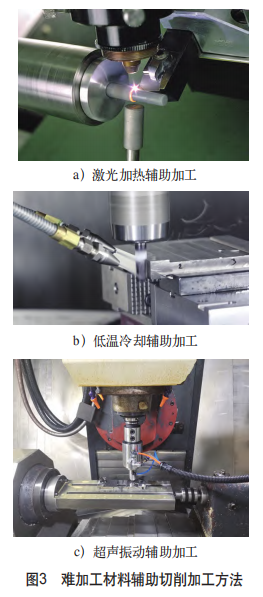 在切削加工方(fāng)法的創新研發方麵,學(xué)者們通過(guò)引入激光加熱、低(dī)溫冷卻等輔助手段(duàn),改善材料的可加工性,實現高效切削加工。激光加熱輔助加工[9](見圖3a)的工作原理是將高功率激光束聚焦到切削刃前的工件表麵,通過光束局部加熱的方式軟化材料,降低材料的屈服強度,從而(ér)降低切削力和減小刀具磨損,提升(shēng)切削加工的(de)質量和效率。