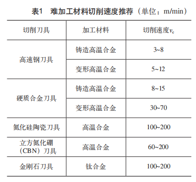切削參數同樣是影響加工效果的重(chóng)要因素,對應材料使用合適的切削(xuē)參數加工能夠有(yǒu)效提高加工質量與效率。以切削速度(dù)參數為例,切削速度低容易在材料表麵形成積屑瘤區,降低表(biǎo)麵加工精度;切削速度高容易發生熱量積聚,引起工件和(hé)刀具的燒傷(shāng)。對此,哈爾濱(bīn)理工大學翟元盛教授團隊(duì)分析(xī)常用難(nán)加工材料的機械物(wù)理(lǐ)性質,通過正交加工試驗(yàn)總結出難加工材料切削速度推薦表(biǎo)[14](見(jiàn)表1),使(shǐ)用表中推薦的刀具和切削速度進行加工能夠有效減小加工(gōng)缺陷與(yǔ)刀具磨損,提高加工質量。