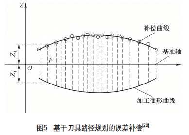 基於上述的預測模型或在(zài)機(jī)測量技術,人們能夠對加工參數進行優化甚至是實(shí)時調控(kòng)。主流的方向是通過刀(dāo)具路徑的重新規劃來對變形和振動造成的誤差進行補償。這一(yī)方向常用的方法是“鏡像補償(cháng)法”[20](見圖5),該方法通過對名(míng)義刀具軌跡進(jìn)行修正,補償單次切削的(de)變形量。但是單次補償會產生新的加工變(biàn)形(xíng),因此需要通過多次補償在切削力和加工變形之間建立迭代關係,逐次(cì)修正變形量。除了基於刀具路徑規劃進行主動誤(wù)差補償的方法之外,許多學者也在研究通過優化調控切削參數、刀具參數等(děng)方式來控製變形和振動(dòng)。對(duì)於某型(xíng)號航空發動機葉片(piàn)的(de)切削加工(gōng),改變加工參(cān)數進行多輪正交試驗,基於試驗數據分析各切(qiē)削參數、刀具參數對葉片加工變形(xíng)、振動響應(yīng)的影響規律[21-23],建立(lì)經驗預(yù)測模型,從而優選加工參數,有效減小(xiǎo)