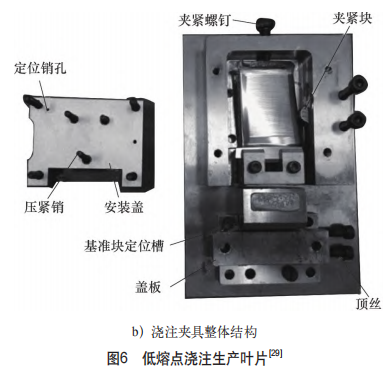 航空發動機葉(yè)片傳統加工(gōng)工(gōng)藝中的工藝裝備是使用低熔(róng)點合金等相變材料進行(háng)填(tián)充輔(fǔ)助支撐,即對工件毛坯進(jìn)行六點定位(wèi)夾持後,將工件的定位基準通過低熔點合金澆注(zhù)成(chéng)為一個澆注塊,對工件進行輔助支撐,並且把複雜的點定位轉換成規則的麵定位(wèi),進而進行待(dài)加工部位的精密(mì)加工(見圖6)。這種工藝方法存在明顯的缺陷:定位基準轉換(huàn)導致定位精度下降;生產準備複雜、低熔點合金的澆注和融(róng)化也帶來(lái)了工件表麵的殘(cán)留和(hé)清(qīng)理問(wèn)題,同時澆注和融化的工況也比較惡劣[30]。為了解決上述工藝缺陷,常用的方法是引入一種多點支撐結構與相變材料相結合[31],支撐結(jié)構上(shàng)端與工件接觸進行定位,下端浸入低熔點(diǎn)合金(jīn)腔室中,基於低熔點合金的相變特性實現柔性輔(fǔ)助支撐。雖然引入支撐結構能夠(gòu)避免(miǎn)低熔點合金接觸葉(yè)片產(chǎn)生的表麵缺(quē)陷,但是受到(dào)相(xiàng)變材料的(de)性能限(xiàn)製,相變柔性工裝無法同時滿足高剛度和高響應速(sù)度兩大需求,難以(yǐ)應用於高效率自動化生產當中。