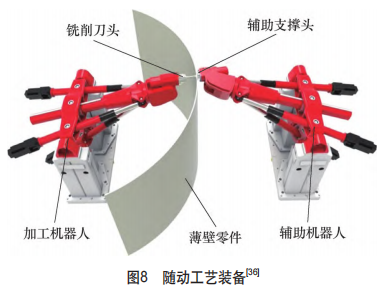 目(mù)前在工藝裝備設(shè)計過程中,普遍使用有(yǒu)限元分析、遺傳算法等手段來優化多點輔助支撐的布局(jú)[35],但是優化的(de)結果通(tōng)常隻能保證在一點上的加工變形量達(dá)到最小(xiǎo),而並不能保證在其(qí)他加工部位也能起到同等的抑製變形效果。在葉(yè)片加工過程中,通(tōng)常在同一(yī)機床上對工件進行一係列的走刀加工,但加工不同部位(wèi)的裝夾需求是不同的,甚至可能是時變的。對於靜(jìng)態(tài)多點支撐方法,如果通過增加輔助支撐(chēng)的數量來(lái)提高工藝係統剛度,一方麵會(huì)增大工裝的質量和體積,另一方麵也壓(yā)縮了(le)刀具(jù)的運動空間。而(ér)如果在加工不同部位時(shí)重新設置輔助(zhù)支(zhī)撐的位置,則必然會中斷加工過程,降低加工效(xiào)率。因此,根據加工過程自動在線調節支(zhī)撐布局和支撐力的隨動工藝(yì)裝(zhuāng)備[36-38]被提(tí)出。隨動工(gōng)藝裝備(見(jiàn)圖8)能夠在任一加工工序開始前(qián),基於時變切削過程的刀具軌跡與工況轉變,通過(guò)刀具與工裝的協同配合實現動態(tài)支撐:先將輔助支撐移動到有助於抑製當前加工變(biàn)形的位置,使工件的加工區域受(shòu)到積極支撐,而工件其(qí)他部位在盡可能少(shǎo)的接觸(chù)下保持定位不變,從而匹配加(jiā)工過程中時變的(de)裝夾需求。