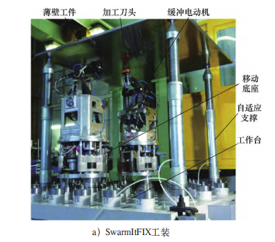 目前,國內外學者均在自重構群夾具方麵進行了一些研究與嚐試。國外方麵,歐盟(méng)項目SwarmItFIX開發了一種新的高度適應性自重構夾具係統[41],該係(xì)統使用一組移動輔助支撐在工作台上自由移動並實時重新定位,以更好地支撐加工零件。SwarmItFIX係統的原型已在該項目中實現(見圖9a),並在一(yī)家意大利飛機製造商的場地上進行(háng)了測試。國內則是有清華大學(xué)王輝團隊製作了一種可與機床協同控製的四點(diǎn)裝夾支撐工作台(tái)[42](見圖9b),可以在(zài)渦輪葉片榫根的精加工過程中對處於懸臂狀(zhuàng)態的榫根進行支撐以及自動刀具避讓。在加工過程中,四點輔助支撐與數控加(jiā)工中心協同配合,根據刀具運動位置重構四點(diǎn)接觸狀態,既避免了刀具與輔助(zhù)支撐相互幹涉,又保證了支撐效果。