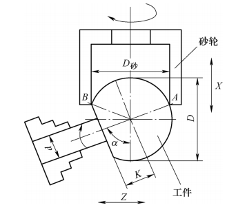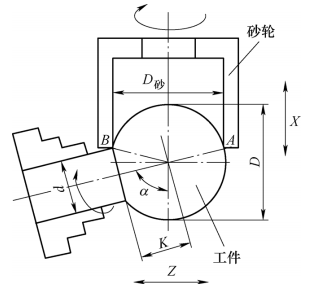 2)安裝(zhuāng):砂輪旋轉軸心線和工件旋轉(zhuǎn)軸心線成α角(jiǎo),交點為被(bèi)加工球體的球心。