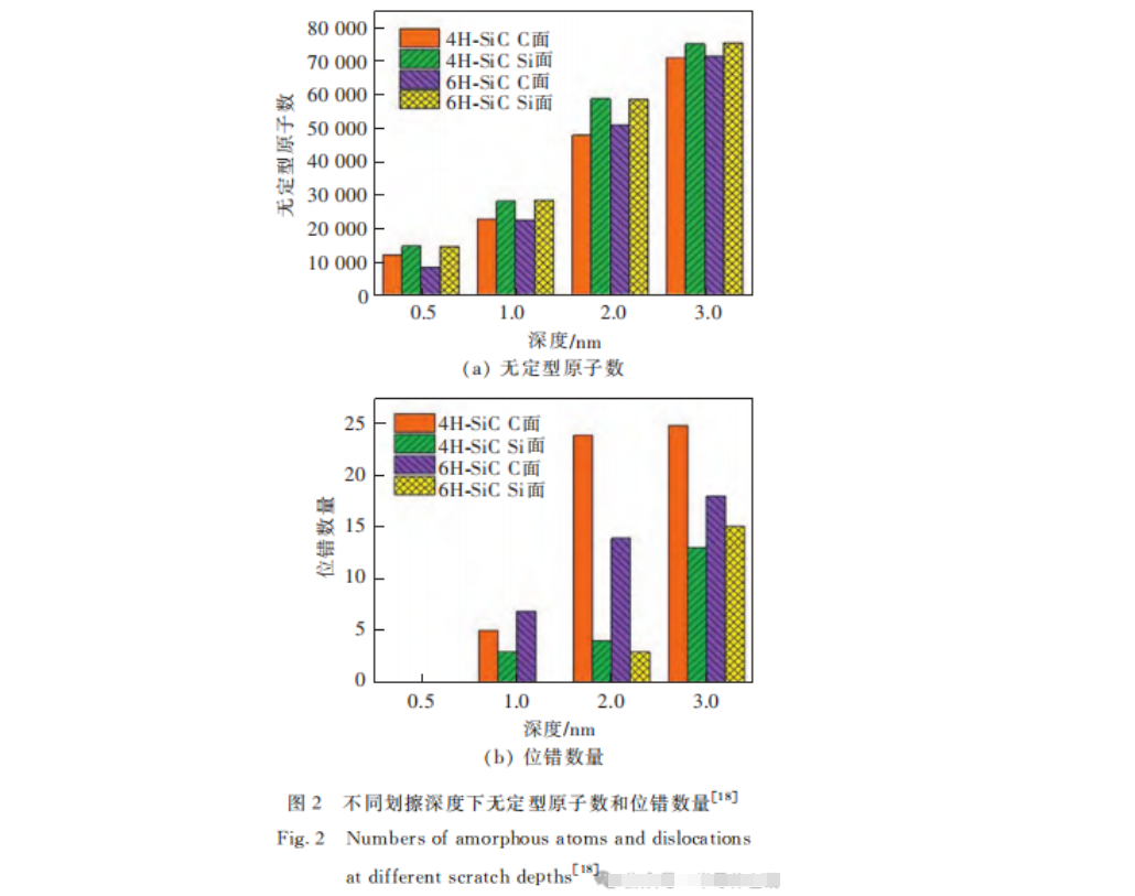2020年,Z.G.Tian等人采用分(fèn)子動力學模擬方法(fǎ),對(duì)4H-SiC和6H-SiC的C麵和Si麵(miàn)進行了劃痕實(shí)驗,研究(jiū)表明,與Si麵相比,C麵的非晶態變形更少,材料的去除更有效,這種劃痕現象與SiC晶體基麵上的位錯有關。圖2為(wéi)不同試件在不同劃擦(cā)深度下無(wú)定型原(yuán)子數和位錯(cuò)數量。2021年,P.Zhou等人采用分子動力學方法研究了多磨粒隨機(jī)分布的固結磨料拋光(guāng)SiC基(jī)片的表麵形貌、亞表麵損傷特征。結果表明,多磨粒在單一粗糙(cāo)麵中的暴露高度和磨粒分布決定了SiC襯底(dǐ)的去除行為;金剛石顆粒在固結磨料拋光墊中的隨機分(fèn)布會使加工(gōng)質量變差。