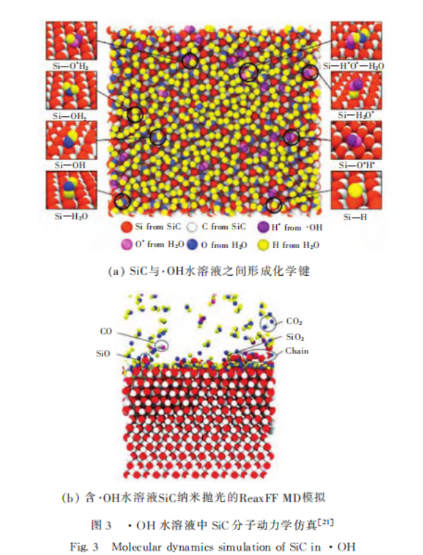 在CMP中除了存在與(yǔ)機械拋光相似的磨料劃擦作(zuò)用(yòng)外,化學作用的影響也至關重要。2021年,孫強采用分子動力學方法分別模擬了CMP中金剛石和SiO2磨粒對SiC表麵原子去除機製(zhì)。結果表明,SiO2在拋(pāo)光過程中比金剛石更容易發生化學反應,原(yuán)因是其通(tōng)過(guò)與SiC表麵原(yuán)子持(chí)續成鍵和斷鍵來實現原子去除(chú)。2023年,Z.W.Yuan等人研(yán)究了SiC在羥基自(zì)由基(·OH)水溶液中的原子行(háng)為。結(jié)果表明,在隻發生化學(xué)氧化的情況下,SiC表麵吸附O、H、·OH生成Si—OH2、Si—OH、Si—H2O和Si—H等,Si原子未曾從SiC表麵脫離,如圖3(a)所示。而在機械(xiè)作用下(xià),部分Si和C原子以(yǐ)SiO、SiO2、CO、CO2或鏈狀(zhuàng)結構脫離基體,其餘Si和C原子(zǐ)則以吸附方式脫離基(jī)體,如圖3(b)所示。這些研究(jiū)有助於從原子層麵(miàn)上解釋CMP中原子氧化去除的動(dòng)力學過程,為揭示材料去除機理提供了一種有價值的方法。