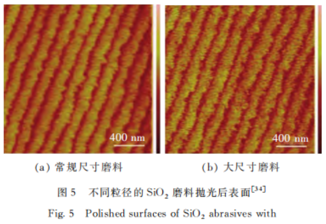 此外,也(yě)研究了不同粒徑的同種磨料對機械作用的影(yǐng)響。2014年,X.L.Shi等人詳細分析了不同磨料(liào)粒徑的矽溶膠對4H-SiC晶圓拋光性能的影響。通過理論推導和實驗分析得出,當磨(mó)料粒徑較大時會導致不規則的平台邊緣。反(fǎn)之(zhī),如果磨料粒徑較小,材料的去除將更規(guī)則,並(bìng)且平(píng)台邊緣將更平坦和光滑,指出(chū)磨料粒(lì)徑是決定CMP效(xiào)率和(hé)晶圓表麵最終平坦化(huà)質量的重要因素。圖5所示為不同(tóng)粒徑SiO2磨(mó)料拋光(guāng)後的表(biǎo)麵,其中常規尺寸磨料平均(jun1)粒徑30.8nm,大尺寸磨料平均粒徑79.3nm。