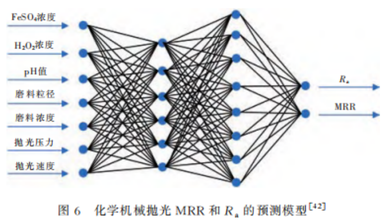 工(gōng)藝參(cān)數與MRR、Ra之間的關係也可以通過建立模型來進行預測,為SiC的CMP加工(gōng)提(tí)供參考。2021年,J.Y.Deng等人基(jī)於改進(jìn)的Preston方程,研究了工藝參數對SiC拋光MRR和Ra的影響,並利用反向傳播神經網絡建立(lì)了MRR和Ra的預測模型,如(rú)圖6所(suǒ)示。結果(guǒ)表明,隨著FeSO4質量分數(shù)、H2O2質量分數和(hé)pH值的升高,MRR呈先升高後(hòu)降低的趨(qū)勢(shì),拋光後Ra呈(chéng)先(xiān)降低後升高(gāo)的趨勢。隨著磨料粒徑、磨料濃度、拋光壓力和拋光速度的增加,MRR不斷(duàn)增大(dà)。Ra隨磨(mó)料粒徑和磨料(liào)濃度的增加(jiā)而不斷減小,隨著拋光壓力的增加(jiā)而增大,隨著拋光速度的增加而先減小後增大。不難看出(chū),在SiC單(dān)晶的CMP中通過工藝優化,對拋光效(xiào)果起到了一定的改善和提高作用。