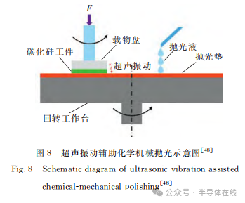 超聲振動輔助化學機械拋光(guāng)(UVACMP)是一種經濟有效地提高SiC單晶拋光性能的技術(shù)。通過超(chāo)聲波發生器將(jiāng)電信(xìn)號轉換成超聲振動,超聲振動作用在拋光區,使拋光液中磨(mó)料更加分散,並且使磨料獲得一定動能,加(jiā)大了拋光中的機械作用,同時振動過程中產生的熱促進了拋光中的化學(xué)作(zuò)用,超聲振動輔助化學機械拋光示意圖如圖8所示。
