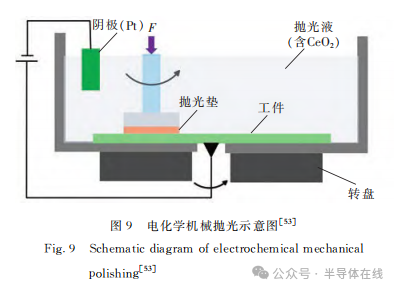 電化學機械(xiè)拋光(ECMP)示意圖如圖9所示。ECMP是一種利用電解液作(zuò)為拋光液(yè),將工件的電化學腐(fǔ)蝕與機械拋光相結合的精密工藝。在單晶SiC(作為陽極)表麵帶電後通過陽極氧化產生氧化層,然後用軟磨(mó)料機械去除氧化層,最後獲得超光滑無損傷的表麵。
