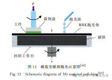 磁流變輔助拋光引入磁流變彈性體(MRE),與化(huà)學機械(xiè)拋光相結合,在外(wài)加磁場、磁性(xìng)拋光墊、氧化還原反應的共同作用下,提(tí)高工件的材料去除(chú)率,降(jiàng)低表麵粗糙度,實現對工件的(de)超精密加工。磁流變輔助拋光示意圖如圖12所(suǒ)示。