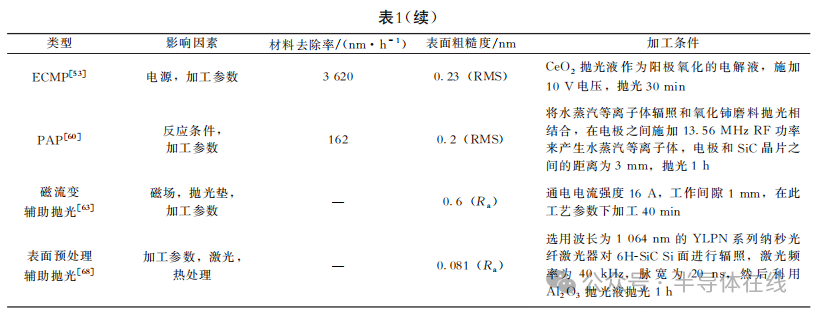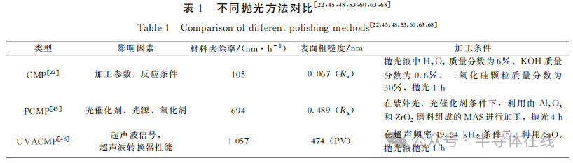 高效率地獲(huò)得光滑表(biǎo)麵是半導體產業的一個關鍵問題,因此材料去除率和表麵粗糙度被認為是評(píng)價單晶SiC拋光工藝兩個最重要指標。不同拋光方法之間的(de)對比如表1所示。