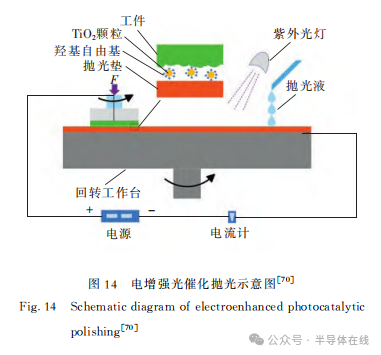 因此多個技術方向複合增效以(yǐ)達到化學氧化作用和機械去除作(zuò)用同時提升的方法,引起了(le)研究者的注意。比如,2019年,Y.He等人開發了一種用於4H-SiC晶圓Si麵的電增強光催化拋(pāo)光方法,如圖14所示。電流可(kě)以有效地防止半導體顆粒表麵產生(shēng)的電子與空穴(xué)的複合,從而提高拋光效率。以P25為光(guāng)催化劑、H2O2為電子捕獲劑的拋光(guāng)液拋光性能最好,MRR約為(wéi)1180nm/h,在1.0μm×1.0μm範圍內,Ra約為0.053 nm。2019年,翟(zhái)文傑(jié)等人對SiC進(jìn)行了超聲-電化學機械研拋實驗。實驗結果表明(míng),在(zài)試件與拋光盤之間的電(diàn)壓為+10V時,材料去除率比無電壓時提高(gāo)了55.1%;當對試件施加超聲-電場作用(yòng)後,材料去除率比無超聲時提高了(le)91.7%。