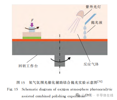 2021年,T.Yin等(děng)人采用高濃度氧氣氛圍與光催(cuī)化輔助拋光相結合,對SiC襯底CMP特(tè)性進行了研(yán)究。結果表明:與常規(guī)空氣氣氛相比,將空(kōng)氣氣氛中的氧(O2)分(fèn)壓增加到(dào)300kPa,Si麵和C麵的(de)材料去除率均增加(jiā)超過2倍(bèi)。實驗示意圖如圖15[72]所示。2022年,鄧家雲使(shǐ)用Fe3O4作為催(cuī)化劑,對電Fenton化學機械拋光進行了研究,利用電場參(cān)數控製CMP中·OH的生成速率和總濃度,實現·OH的持續、穩定、可控生(shēng)成,加速SiC的(de)氧化腐蝕作用,從而達到與磨粒去除的協(xié)同效應,最終MRR為2358nm/h、Ra為0.372nm。